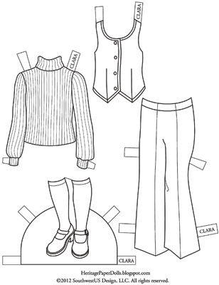 Clara is a free, printable paper doll. Clara will continue to be available on this blog as long as I post new fashion pages for her. You can read the introduction for the Clara paper doll here.